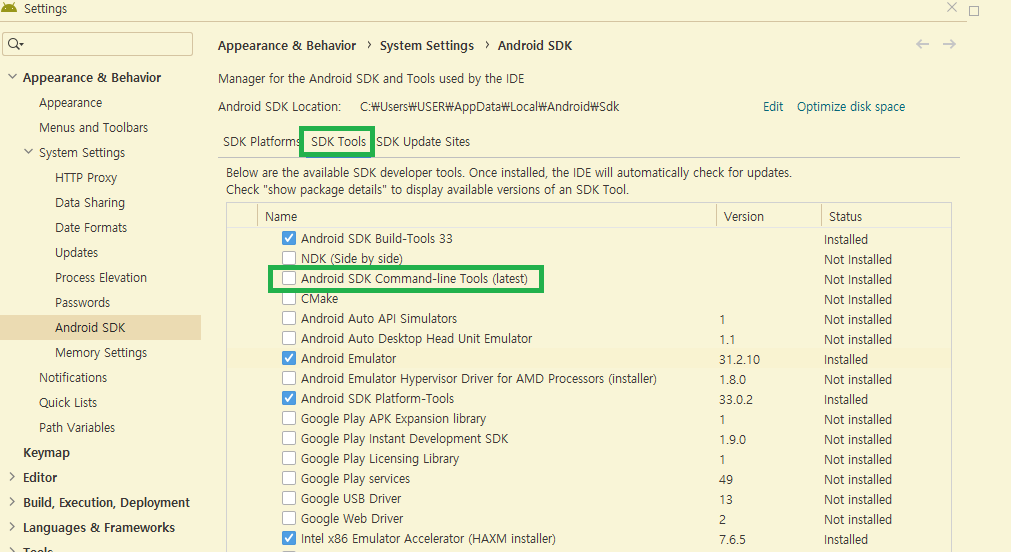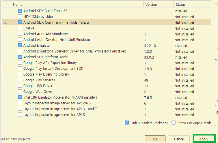 SDK Tools 탭에서 Android... 저기 초록 네모 체크 후