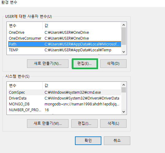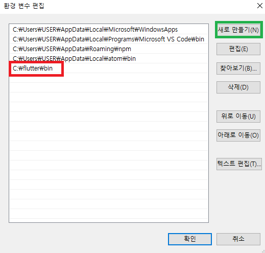 새로만들기 후 압축해제 한 Flutter의 bin폴더 경로로 복붙! 후에 확인 눌러서 저장합니다.