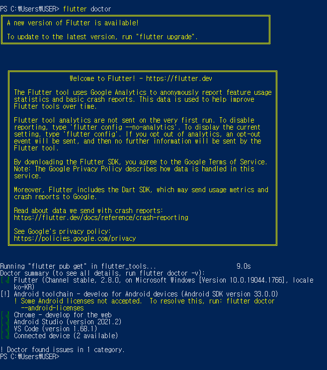 2. 터미널 or PowerShell, cmd로 flutter doctor 입력