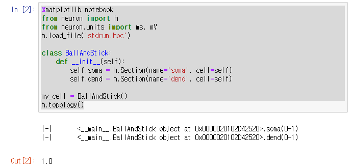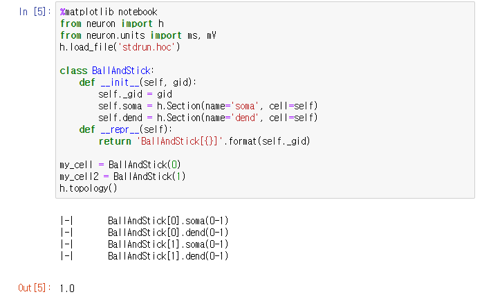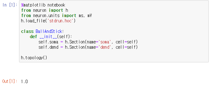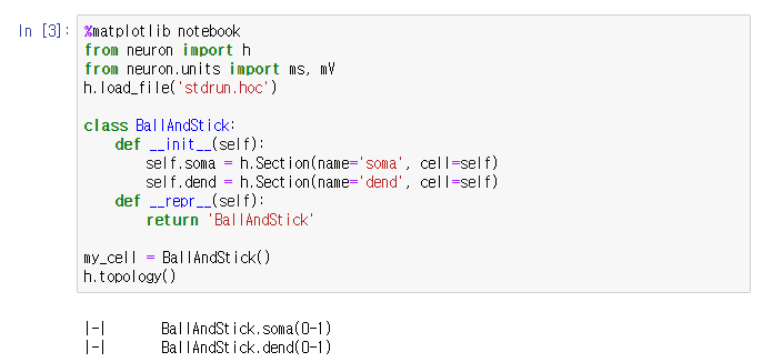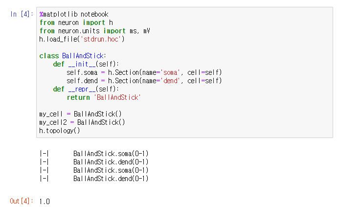 이렇게 BallAndStick 클래스를 선언하고 Section을 생성해야 합니다. __init__함수는 생성자입니다.