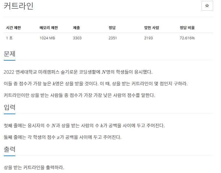 점수들을 배열로 저장하고 내림차순으로 정렬하여 k-1번 째 값을 출력하면 커트라인이 출력됩니다.