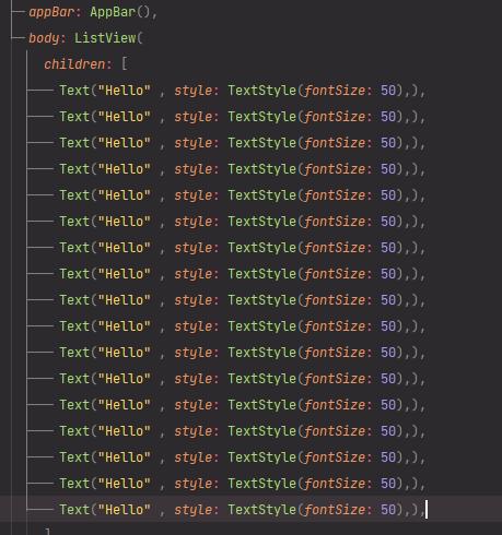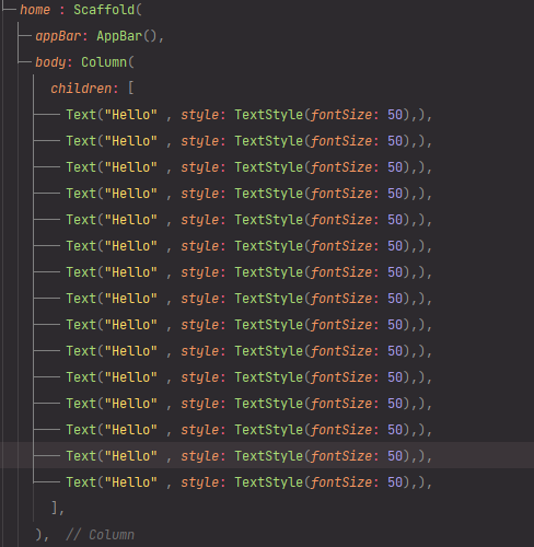 이처럼 Column 위젯 안에 Text 위젯을 많이 넣으면 스크롤이 생기지 않고 너무 많이 넣었다고 오류가 나는데