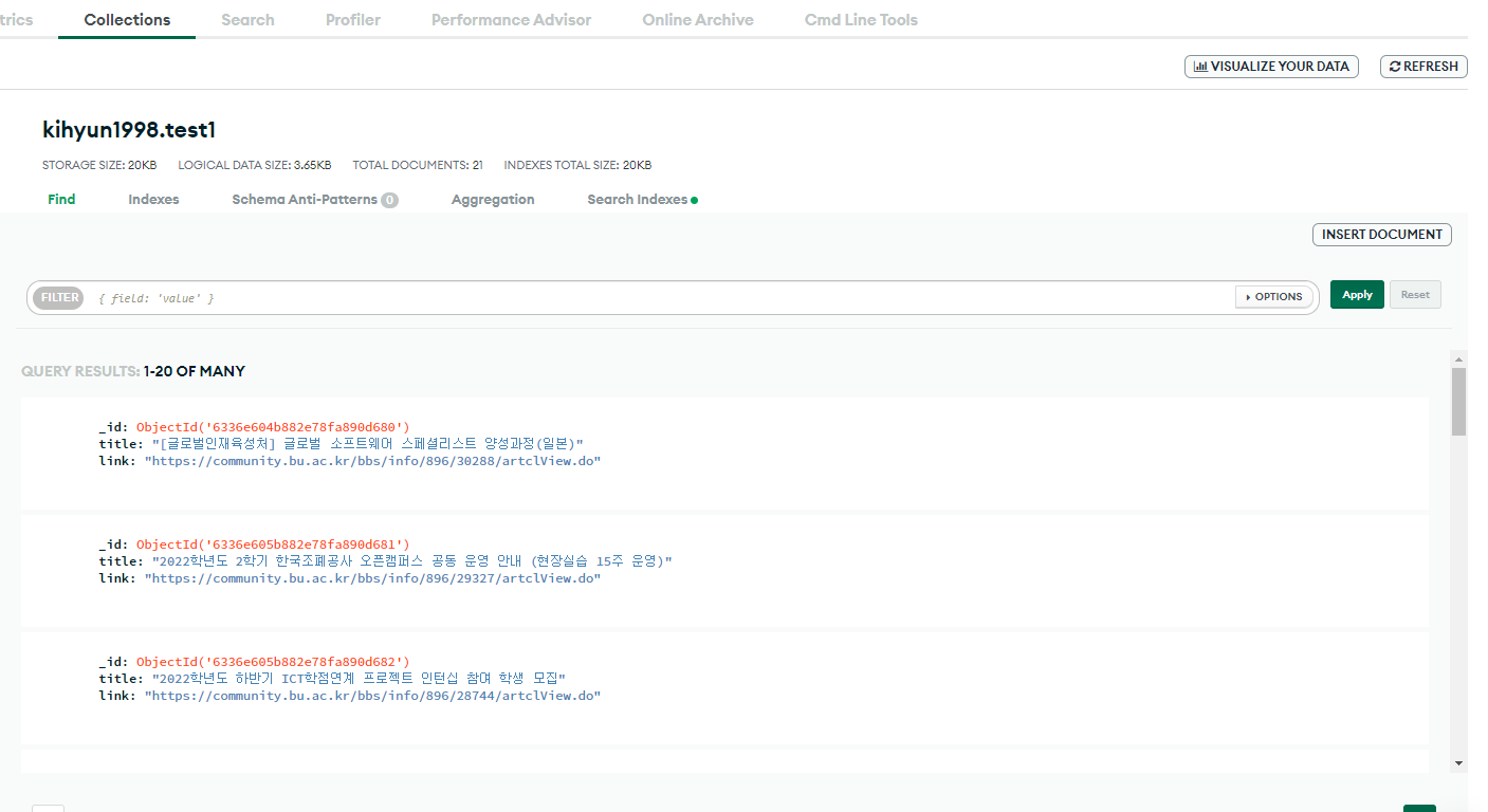 크롤링 파일을 실행하고 MongoDB로 돌아와서