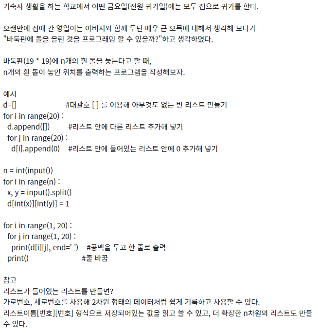 이렇게 0으로 채워진 바둑판을 만들었고 이제 해당 칸에만 1로 바꿔주면 됩니다.
