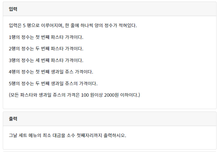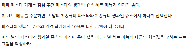 파스타 가격과 쥬스 가격을 따로 배열들에 저장해놓고 찾을 것입니다.
