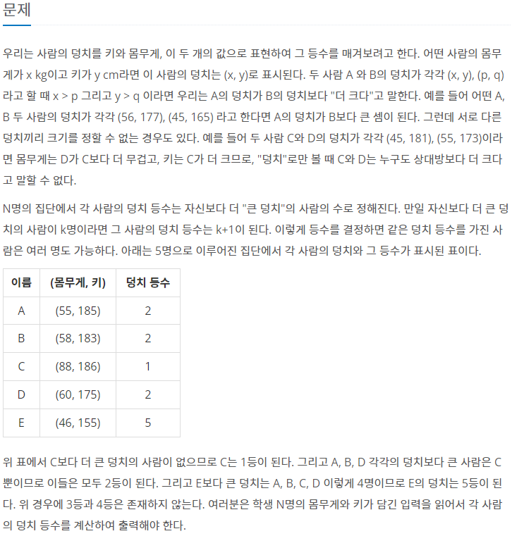 문제요약 : 덩치 비교 알고리즘을 만드는 것인데, 덩치란 키와 몸무게를 비교했을 때 숫자가 더 높은 사람이 덩치가 큰 사람이 된다. 이 때 비교대상과 비교했을 때 키는 크고 몸무게가 작다면 덩치의 크고 작음을 구분할 수 없기 때문에 그대로 둔다.