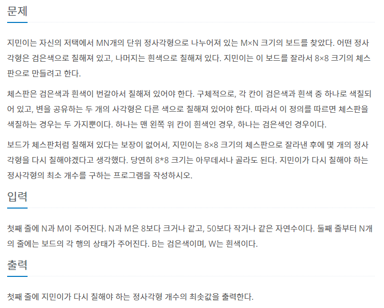 문제 요약 : 먼저 체스판의 규격을 입력받습니다.그리고 체스판이 입력되는데 W와 B로 표현됩니다. 이 때 임의의 8x8 체스판을 뽑아 체스판 규칙에 맞지 않는 (다시 색을 칠해야 하는) 부분의 최소의 수를 구해야 합니다.