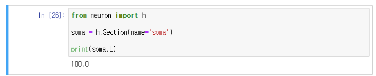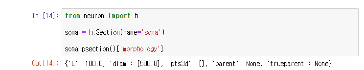 위와 같은 방식으로 morphology 안에 소마의 길이('L'), 지름('diam')를 확인할 수 있습니다.