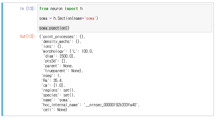 모든 뉴런 섹션은 psection(properties of the section)을 갖고 있습니다. 섹션의 속성에 대해서 파이썬의 dictionary 형식으로 반환해줍니다.