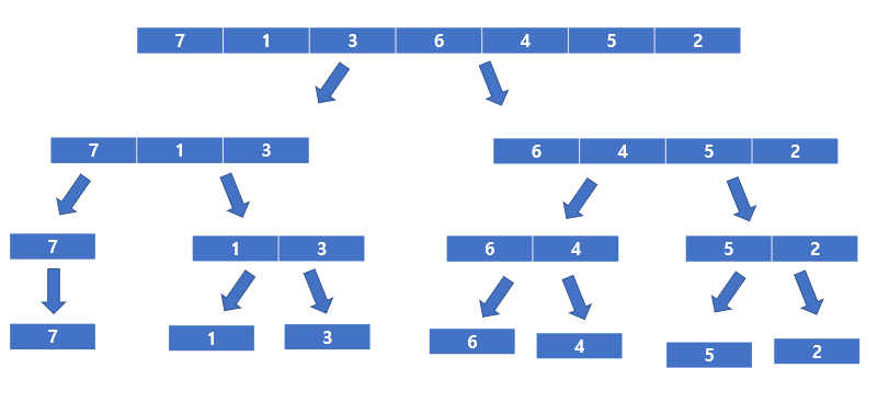 먼저 이렇게 배열이 있따면 배열의 길이가 1이 될 때 까지 나눕니다.